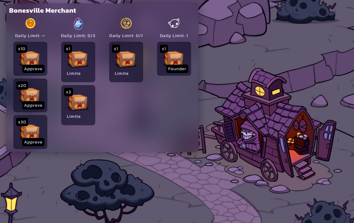 Greedy for *$GRVE* like few others in Bonesville, the merchant has traveled the underworld talking to the best doctors around and managed to acquire the cures needed to remove these afflictions from your *EvoSkulls/Pets*. He has made sure to bring with him a proper stock of these items.